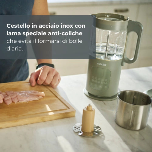 Der Nuvita Magic Pappa 7-in-1 Multifunktions-Babynahrungszubereiter mit Nuvita Chef Rezeptbuch (1967) ist die ideale Küchenmaschine, um Eltern beim Beikoststart auf einfache, sichere und natürliche Weise zu unterstützen. Mit diesem Gerät können Sie kochen, pürieren, zerkleinern und vollwertige Babynahrung zubereiten , wobei die Nährstoffe erhalten bleiben. Zusammen mit dem Nuvita Chef Rezeptbuch hilft er Ihnen, den Speiseplan Ihres Babys mit gesunden und ausgewogenen Gerichten abwechslungsreich zu gestalten.