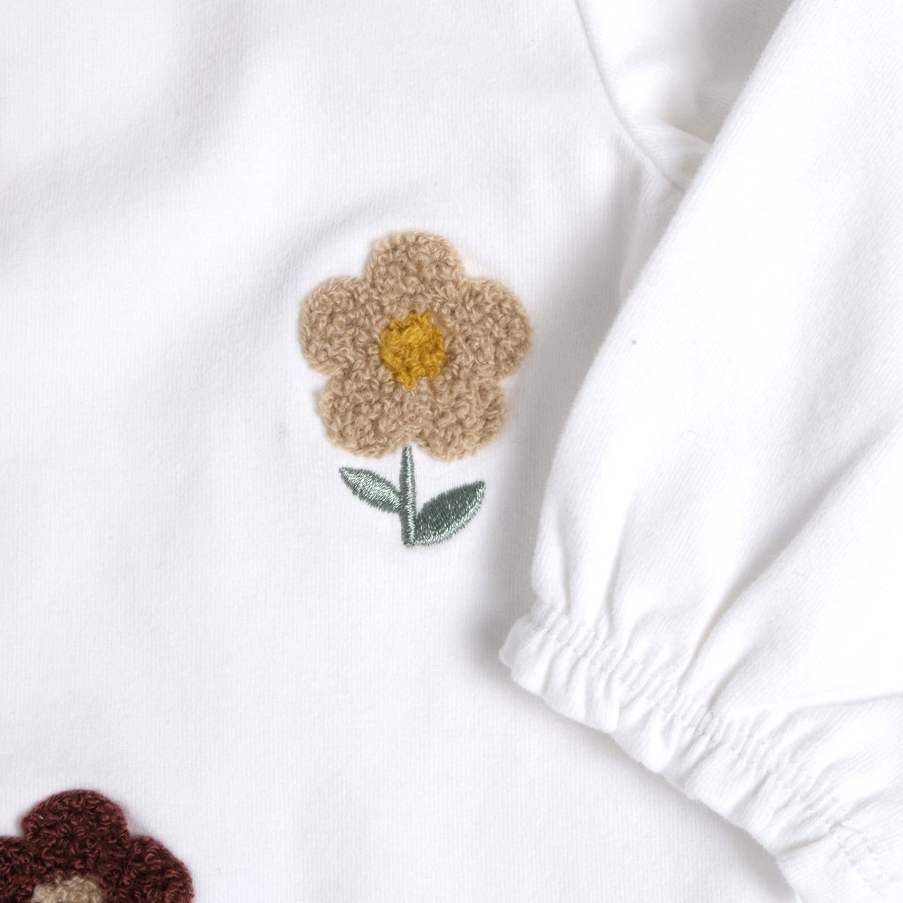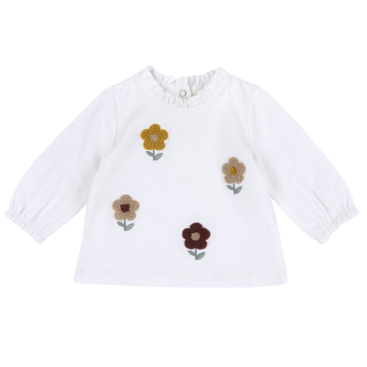 Maglietta girocollo con rouche, manica lunga, in jersey elasticizzato. Con ricamo fiore punto spugna.